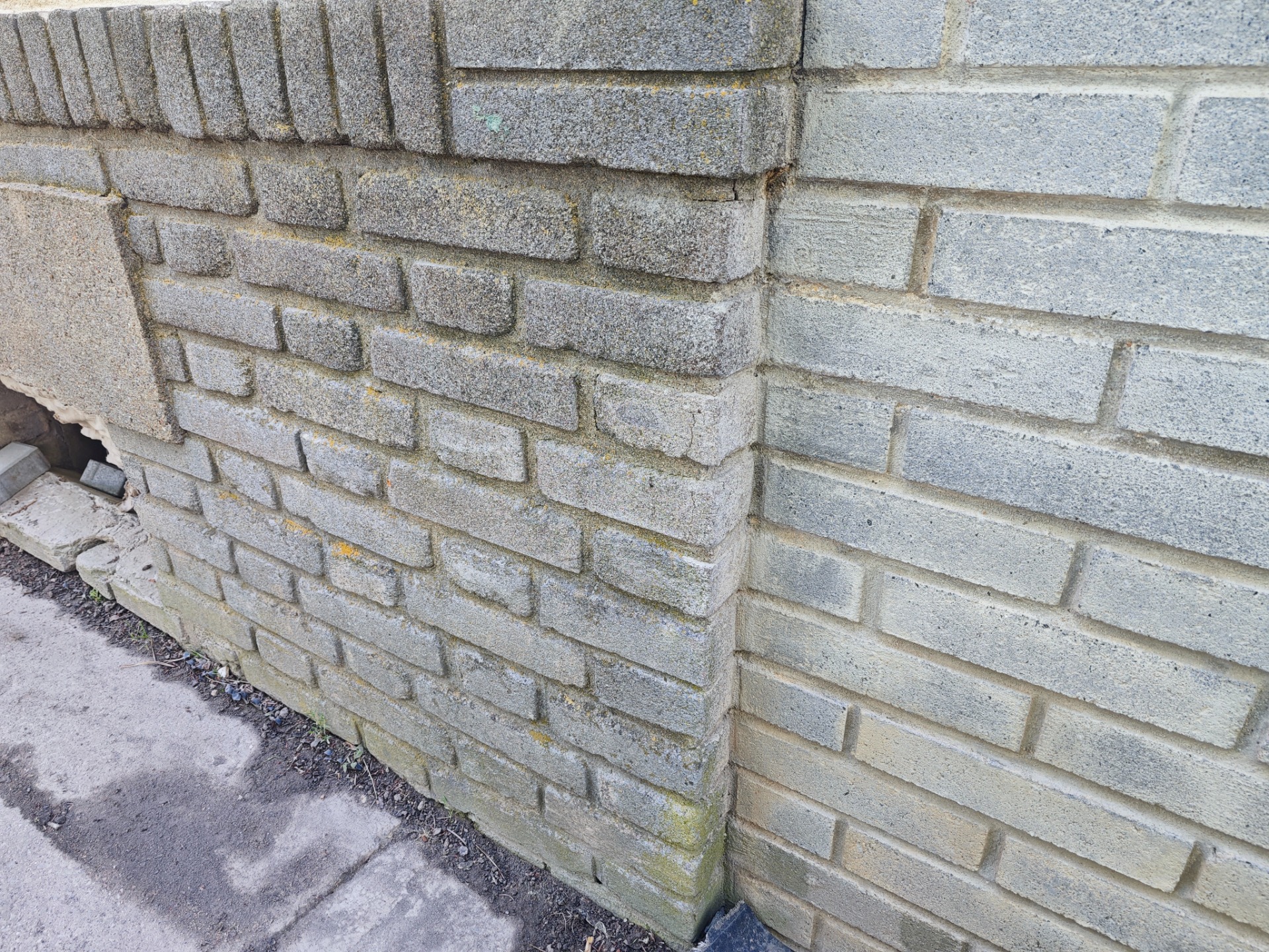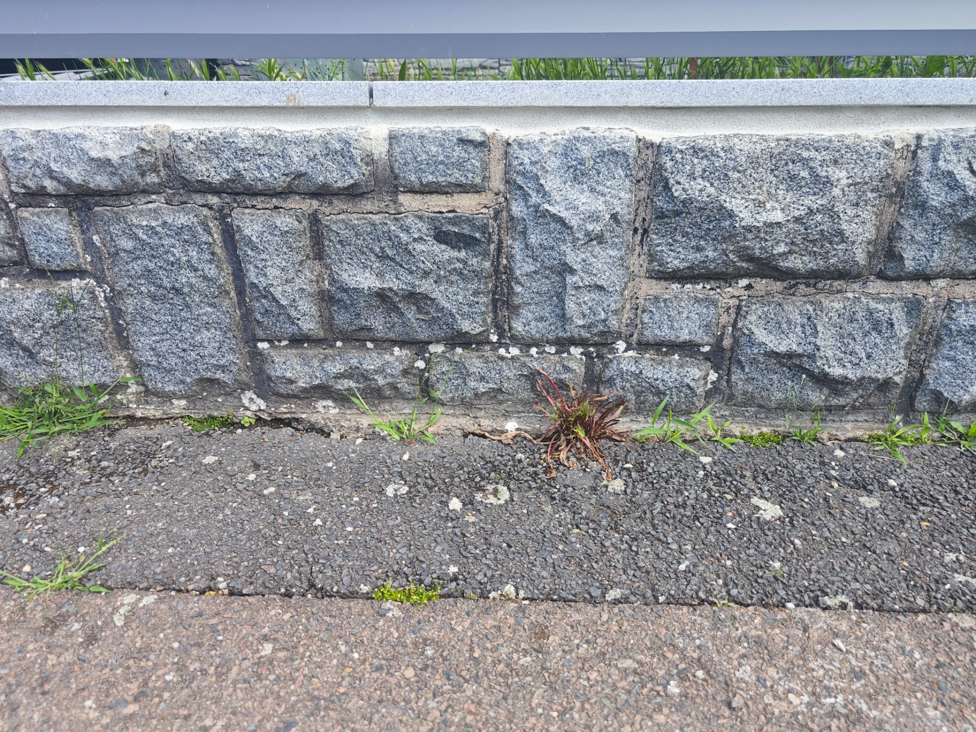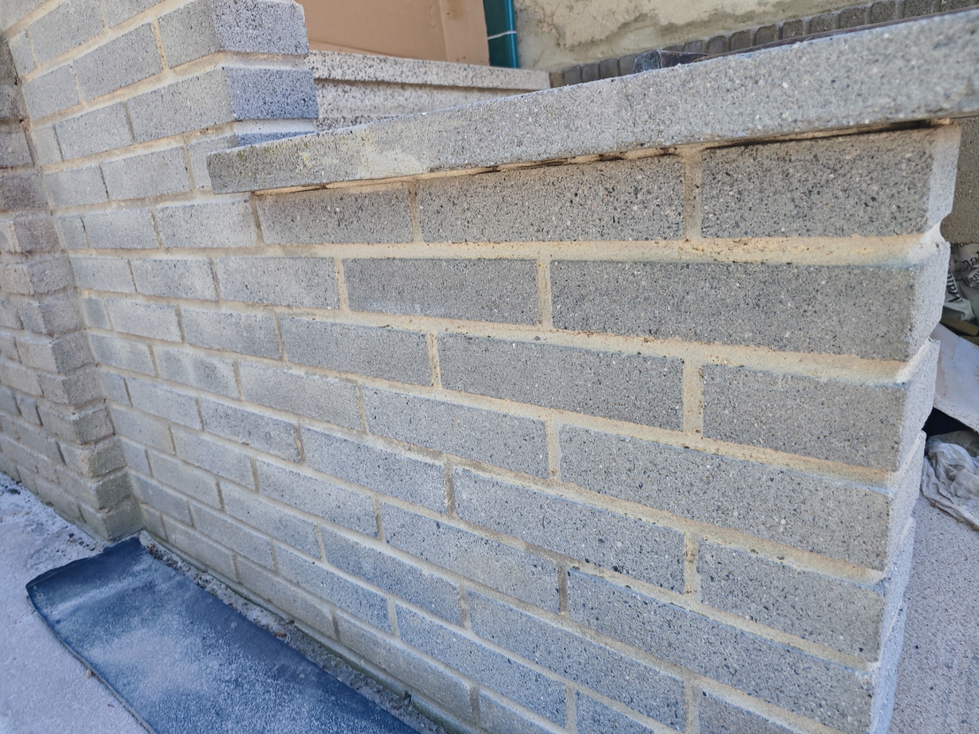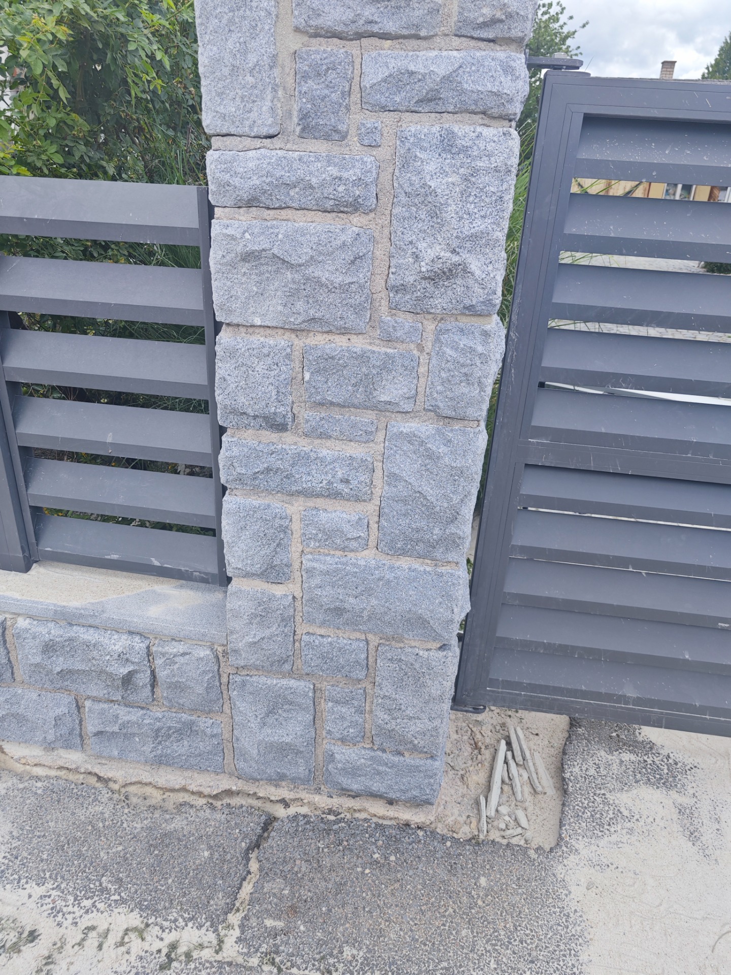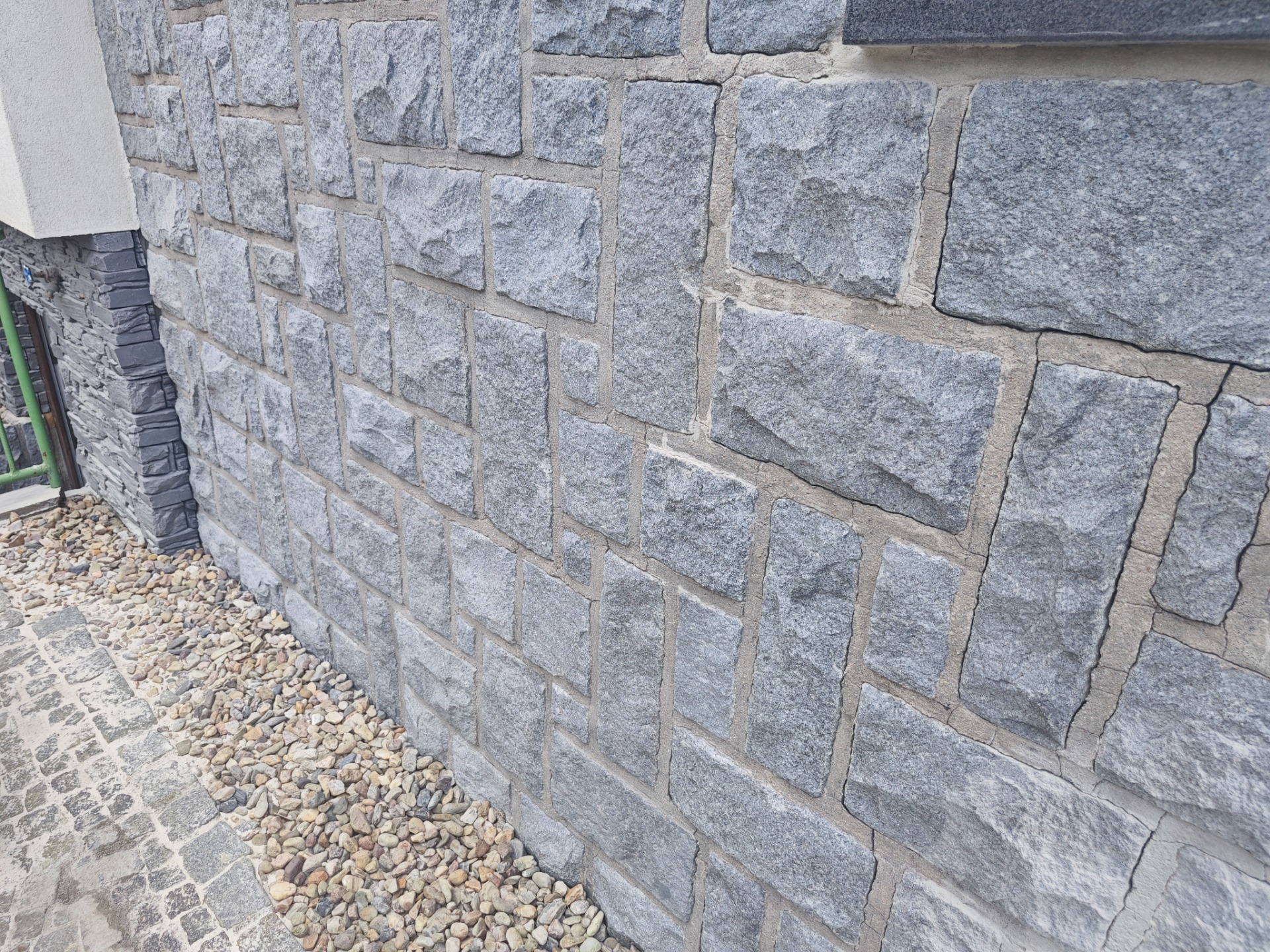 Žulová podezdívka plotu rodinného domu. Byla použita tryska s vodní clonou, snižuje prašnost o 80 %.